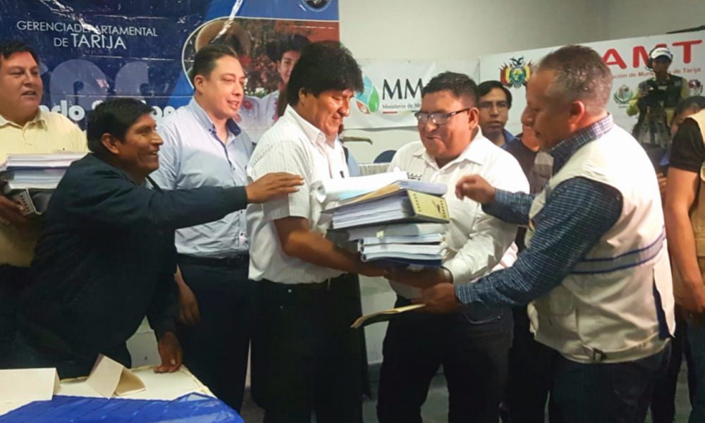 El presidente Evo Morales, junto al ministro de Medio Ambiente y Agua, Carlos Ortuño, recibió el sábado, 46 proyectos de alcaldes y alcaldesas del departamento de...